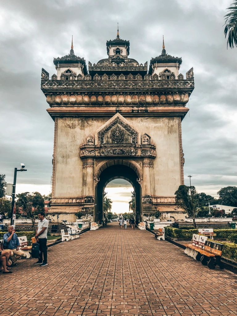 Then you have the Patuxai Arch which is located on a long boulevard. You can immediately see the French influence in the construction because it looks like the Arc de Triomphe in Paris. You can go up there to see a view of all Vientiane.